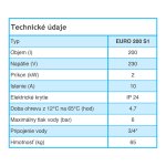 EURO 200 S1 je stacionárny, na zemi stojaci, ohrievač vody s objemom 200 litrov. Ohrievač má zabudované elektrické ohrievacie teleso s príkonom 2 kW a je vybavený jedným vykurovacím výmenníkom na pripojenie externého teplovodného zdroja, napr. kotla ÚK alebo solárneho systému.