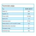 EURO 300 S1 je stacionárny, na zemi stojaci, ohrievač vody s objemom 300 litrov. Ohrievač má zabudované elektrické ohrievacie telesá s príkonom 6 kW a je vybavený jedným vykurovacím výmenníkom na pripojenie externého teplovodného zdroja, napr. kotla ÚK alebo solárneho systému.